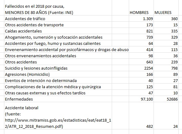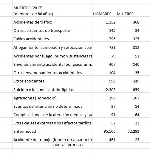 Radiografía de una situación comparativa entre hombres y mujeres en España: la de los fallecimientos. Lo que se puede comprobar es que por todas y cada una de las causas de muerte en España, sin excepción, mueren muchos más hombres que mujeres durante las edades jóvenes, concretamente hasta los 80 años de edad. Los datos están extraídos del INE, excepto los de accidente laboral, que no los facilita este organismo y los he sacado de la prensa. Simplemente he sacado la tabla con los fallecimientos por causa, sexo y edad, y he sumado en una hoja de excel las muertes de hombres y mujeres por debajo de los 80 años en cada una de las causas de muerte. Lo he hecho para los años 2017 y 2018. El resultado es el anunciado. Mueren muchos más hombres que mujeres por todas y cada una de las causas de muerte hasta bien entrada la vejez, donde las mujeres fallecen más porque son las que quedan vivas a esas edades. Así pues, cuando alguien diga barbaridades como «En España ser mujer es un riesgo» o disparates similares, sencillamente está mintiendo. España es además el segundo país del mundo con mayor esperanza de vida, y dentro de ese casi récord, las mujeres tienen una esperanza de vida 5,5 años superior a la de los hombres, así que no, si hay un colectivo en el mundo que no pueda quejarse de seguridad es precisamente la mujer española.