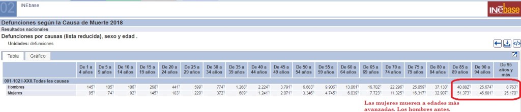 Y aquí, la misma tabla señalando en rojo las franjas en que mueren más mujeres que hombres y en azul donde mueren más hombres que mujeres. La predominancia de las muertes de mujeres se concentra en la enfermedad en las edades más avanzadas:
